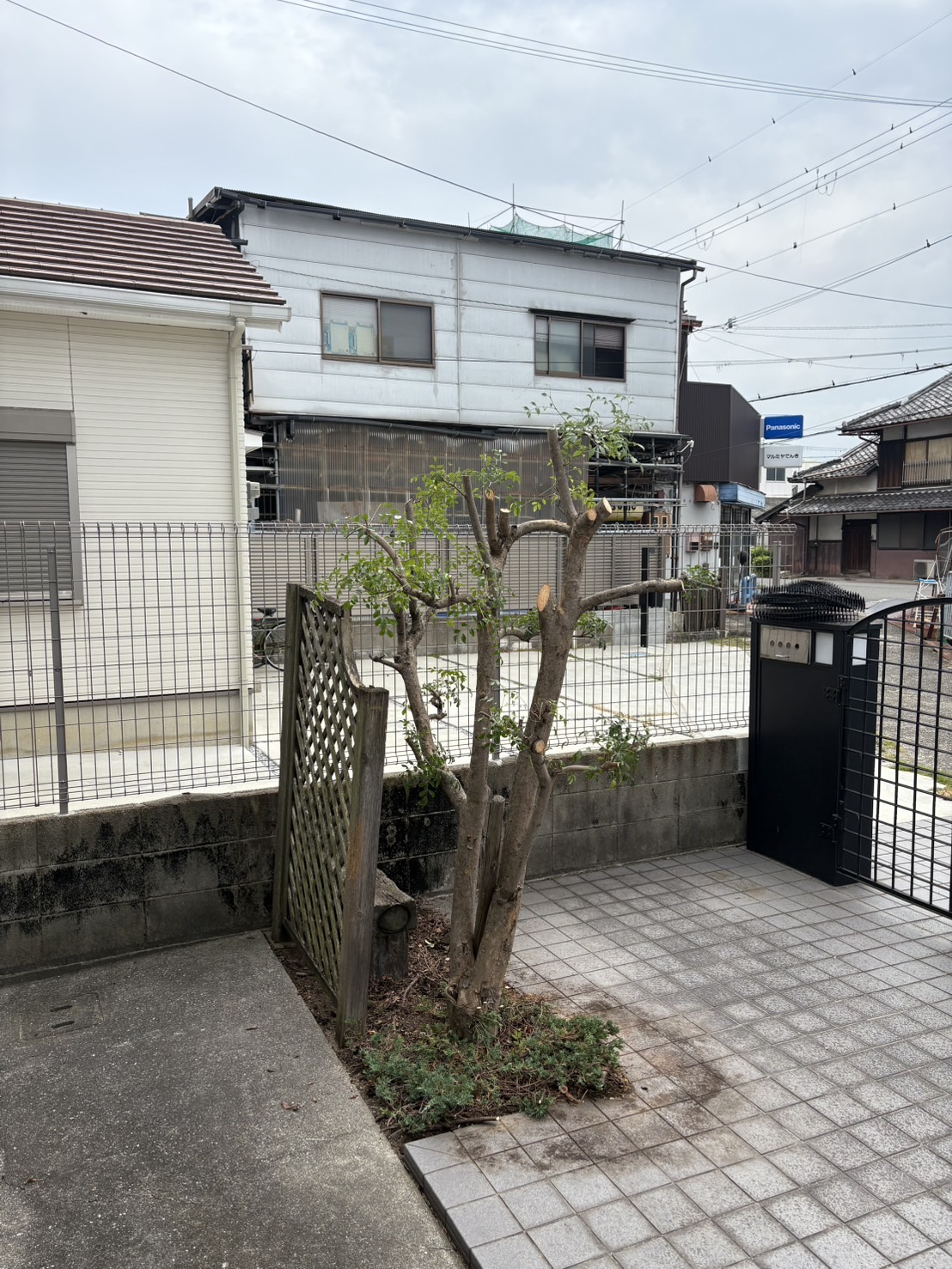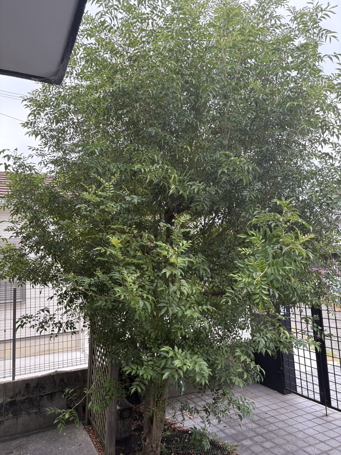 野々市市のお客様から「玄関前の木が気づいたら2階くらいの高さになってしまって、玄関も暗くなるし、毎日の出入りで邪魔なんです」とご相談をいただきました。